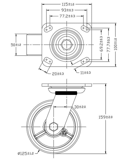 Ø 125 mm | Zestaw kołowy, koło obrotowe bez hamulca: żeliwo poliuretan, płyta mocująca, łożysko wałeczkowe, nośność 290 kg | 1043-125