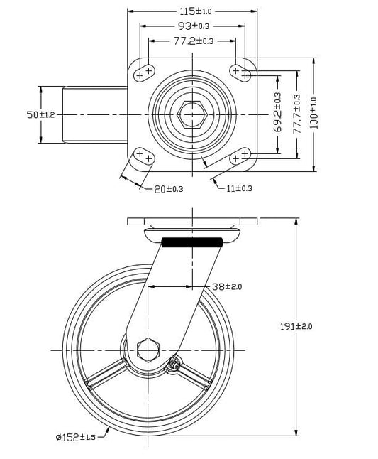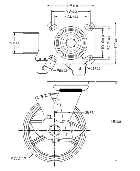 Ø 152 mm | Zestaw kołowy, koło obrotowe z hamulcem: żeliwo poliuretan, płyta mocująca, łożysko wałeczkowe, nośność 370 kg | 1044-152