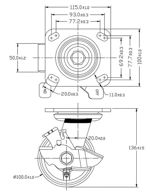 Ø 100 mm | Zestaw kołowy, koło obrotowe z hamulcem: żeliwo poliuretan, płyta mocująca, łożysko wałeczkowe, nośność 240 kg | 1044-100