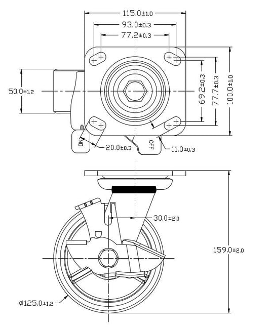 Ø 125 mm | Zestaw kołowy, koło obrotowe z hamulcem: żeliwo poliuretan, płyta mocująca, łożysko wałeczkowe, nośność 290 kg | 1044-125