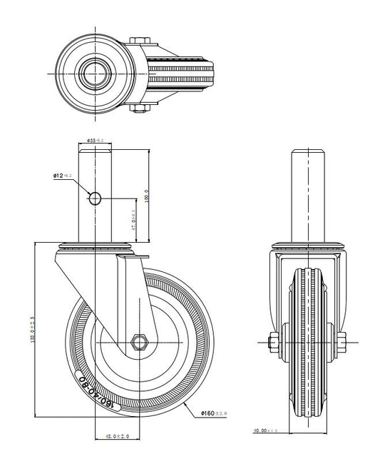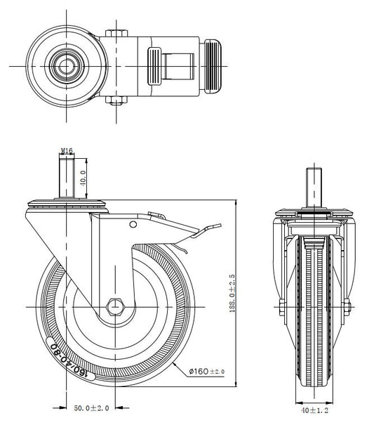 Ø 160 mm | Zestaw kołowy, koło obrotowe z hamulcem: metal guma, mocowane na trzpień, łożysko wałeczkowe, nośność 125 kg | 1158-160