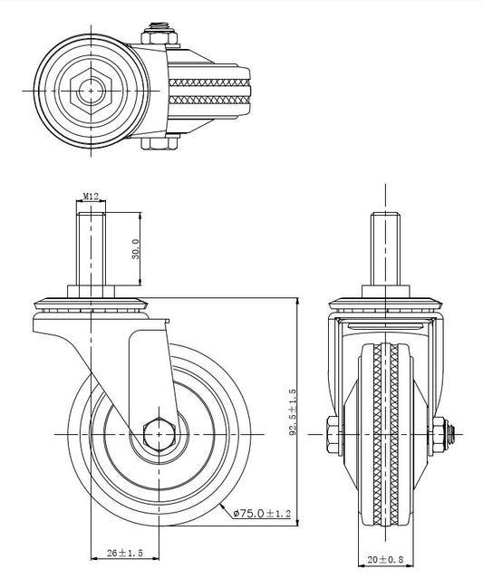 Ø 75 mm | Zestaw kołowy, koło obrotowe bez hamulca: metal guma, mocowane na śrubę, łożysko wałeczkowe, nośność 50 kg | 4008-75